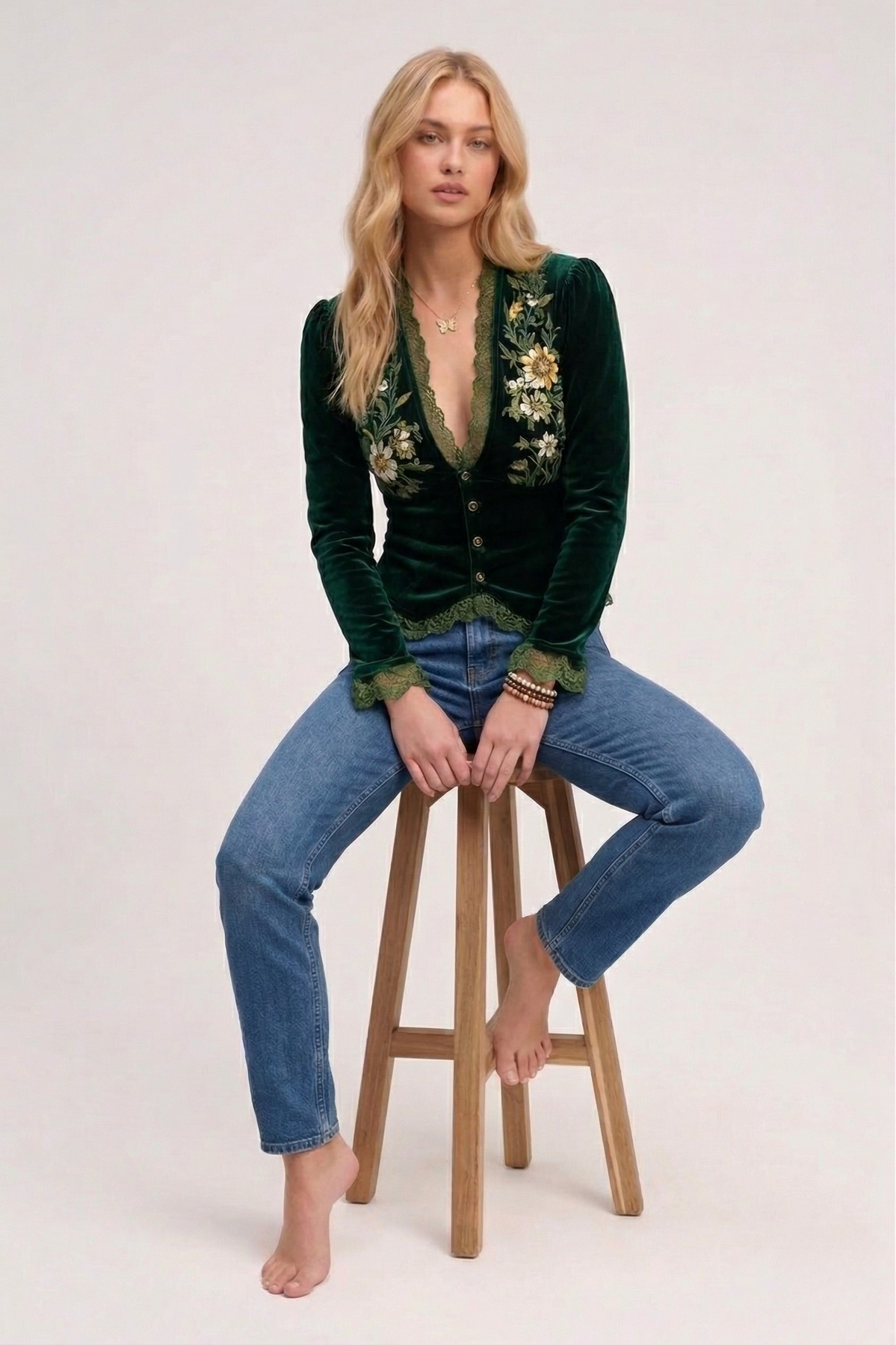 Sophisticated and effortlessly polished, this long-sleeve velvet top combines luxurious texture with delicate floral embroidery for timeless appeal. The flowing silhouette drapes naturally over the body, offering flattering movement and refined balance. Designed for versatility, it pairs beautifully with trousers, skirts, or jeans, making it an elevated yet effortless choice for everyday wear or special occasions.